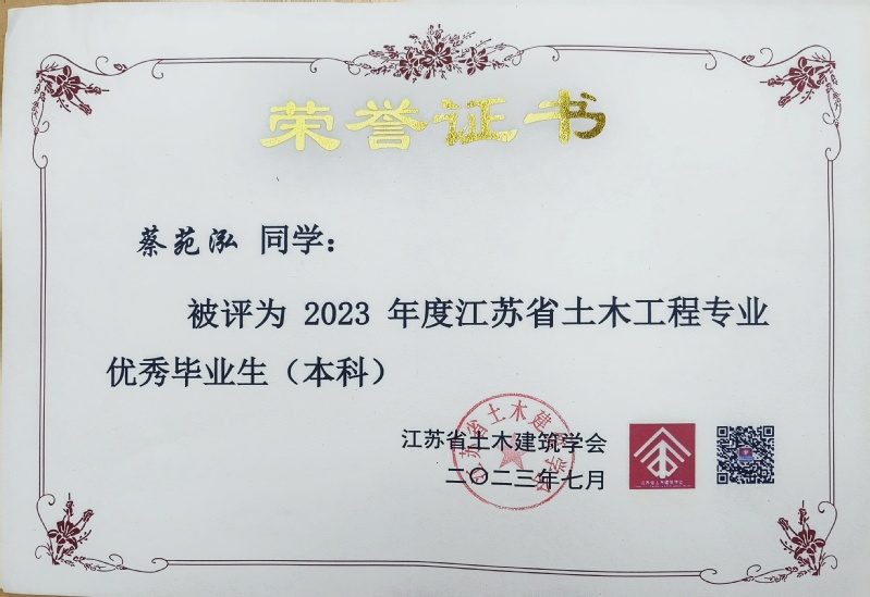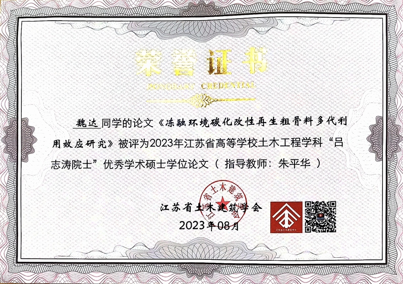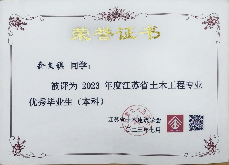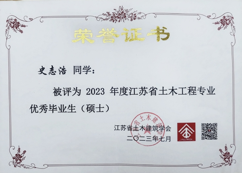 近日,从江苏省土木建筑学会传来喜讯,城市建设学院2023届本科毕业生土木工程专业俞文祺、蔡苑泓获评“2023年度江苏省土木工程专业优秀毕业生(本科)”,工程管理专业陈一诺获评“2023届江苏省大学生工程管理专业优秀毕业生”,硕士毕业生史志浩获评“2023年度江苏省土木工程专业优秀毕业生(硕士)”。硕士毕业生魏达的毕业论文《冻融环境碳化改性再生粗骨料多代利用效应研究》(指导教师:朱平华)被评为“2023年江苏省高等学校土木工程学科‘吕志涛院士’优秀学术硕士学位论文”。