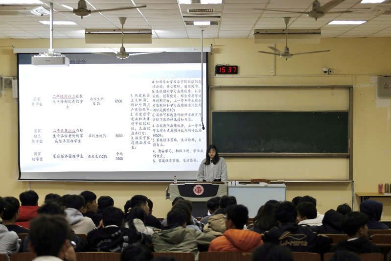 讲座共分为资助介绍和入党启蒙两个部分。讲座伊始,邵丹迪带领新生深入学习我校贫困生认定、各类奖助学金评选、助学贷款、勤工助学等相关文件制度及申请办理流程,解答同学们关于奖助方面的疑惑。同时,她还对我校学生各类奖学金评选办法进行讲解。讲座后半场,程成从党的光辉历史、党的性质及宗旨、党的发展流程、入党关键时间节点和要求讲起,以图文并茂的方式向新生讲解了入党流程、党员发展及教育等内容,讲座中同时对入团流程进行讲解;讲座的最后,程成希望新生们积极向党组织递交入党申请书,端正入党动机,争取早日成为一名光荣的共产党员,实现自我的升华。