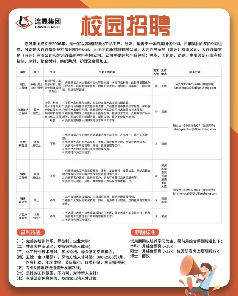 连晟集团2026年校园招聘会需求岗位:1、研发工程师:工作地点大连,要求硕士及以上。2、应用工程师:工作地点常州,要求硕士。3、销售工程师:工作地点苏州、常州、东莞、天津、济南、重庆、大连,要求本科及以上。4、销售管培生:工作地点苏州、常州,要求硕士。5、大客户储备生:工作地点常州,要求本科及以上。联系方式:赵女士19951175310(同微信)